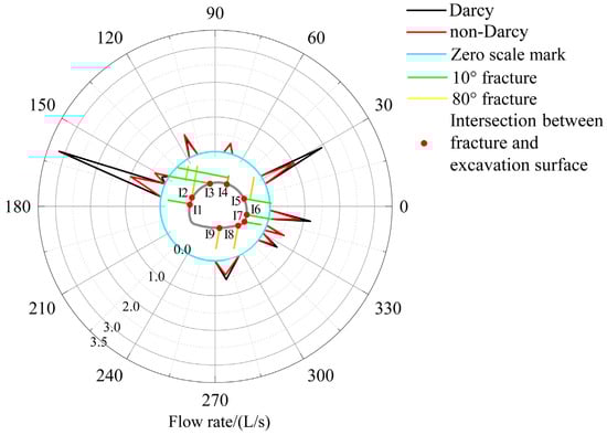 The fluid velocities of Darcy flow and non-Darcy flow are shown in Figure 14a,b, respectively. As the permeability of fracture is extremely high compared to the rock matrix, evident channeling flow is observed in this fractured rock mass. Notably, the maximum flow velocity of Darcy flow was higher than that of non-Darcy flow, consistent with the inflow rate shown in Figure 11. In both cases, the maximum flow velocity was found at the intersection points of fractures and the tunnel section, which are crucial for evaluating water inflow. Therefore, the inflow rate at these intersection points in the stationary flow stage are presented in Figure 15 and Table 2. There was a notable difference in inflow rate between Darcy flow and non-Darcy flow when the flow rate at intersection points exceeded 0.55 L/s. Conversely, the difference in inflow rate was not sizeable between Darcy flow and non-Darcy flow. At intersection point I5, the difference reached 69%, and the Fo value reached 12.87. This phenomenon is attributed to the non-Darcy effect. Higher flow rates lead to greater resistance, resulting in large deviations of non-Darcy flow from Darcy flow, whereas lower flow rates reduce such effects. However, there is an exception at intersection point I2, where the inflow rate of Darcy flow is lower than that of non-Darcy flow, because the intersection points I1, I2, I3, and I4 are connected with each other through the fracture network. When the inflow rate at intersection point I1 is significantly limited by the non-Darcy effect, the fluid is redirected to neighboring intersection points, such as I2, I3, and I4. It is clear that non-Darcy flow substantially reduces water inflow relative to Darcy flow for flow velocities above a certain threshold. However, the variation in inflow rate at each intersection point within connected fracture networks is often uneven. In general, the inflow rate at intersection points of fractures and tunnel sections is higher than that at other locations in the tunnel section, and different intersection points react differently to the non-Darcy effect. In summary, when predicting water inflow into tunnels, it is necessary to consider the combined effect of non-Darcy flow and complex fracture networks.