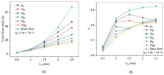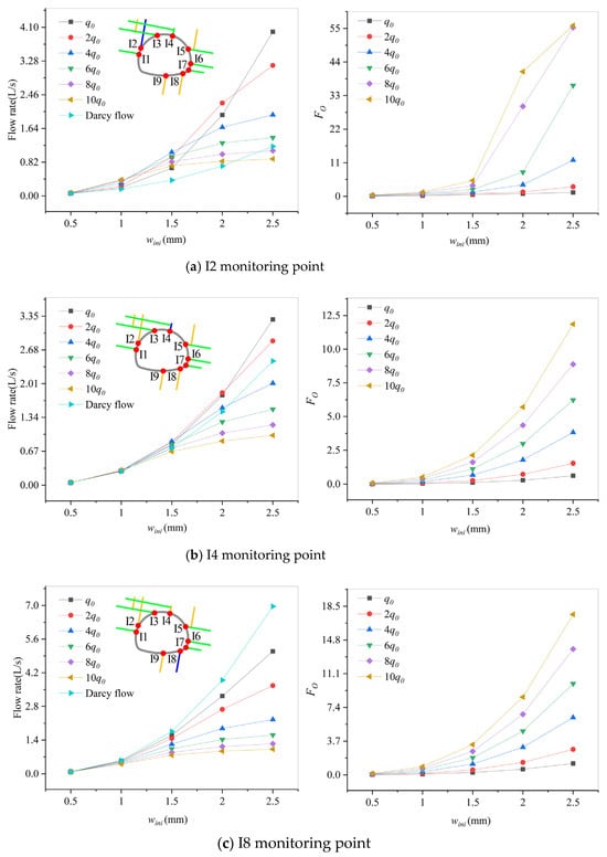As shown in Figure 27a–c, the flow rate curves in I2, I4, and I8 follow a pattern similar as the total flow rate curves. Fo, however, does not exhibit a tendency to stabilize. Furthermore, I2 and I4 exhibit behavior similar to that of I3, where non-Darcy flow rates exceed Darcy flow rates. When wini ≥ 2 mm and q ≥ 6q0, the value of Fo is close to that of I1, but their flow rates differ.