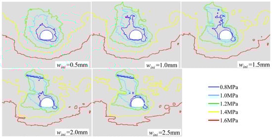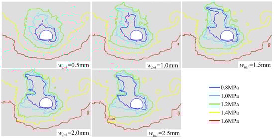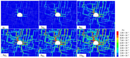 The model’s upper boundary is situated at a depth of 190 m. The initial vertical stress is derived from a density of 2200 kg/m3, and the ratio of initial lateral pressure to initial vertical pressure is set to 0.75. As shown in Figure 10, the displacement in the normal direction at the bottom and both sides are fixed, and a constant external stress of 4.18 MPa is applied to the top boundary. The pressure on the left, right, and bottom is kept constant, and the upper boundary is designated as the free boundary and is in contact with the free water table. The horizontal plane is simultaneously positioned at the boundary of the model, precisely at an elevation of 130 m. A stable water pressure layer with a water pressure of 1.3 MPa is positioned at the top of the model. The water pressure below the top of the model is increased based on the water’s own weight base on 1.3 MPa. The total water inflow rate on the tunnel section and the individual flow rate at the intersection point (I1–I9) are recorded for evaluation of the results.