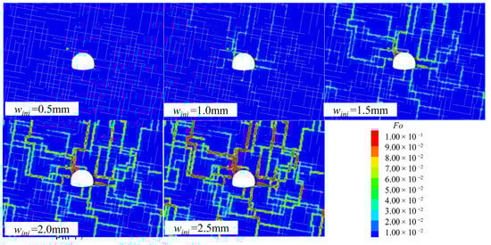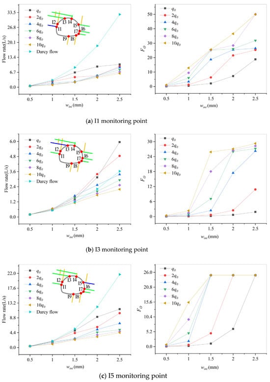 Comparing the three monitoring points associated with 10° fractures, the non-Darcy flow significantly impacts the flow rate when wini ≥ 1.5 mm. Furthermore, when q ≥ 6q0 and wini ≥ 1.5 mm, the Fo tends to stabilize in I3 and I5. Within this stable range, the flow rate increases gradually from 1.9 to 2.3 L/s. Notably, though the maximum Fo of I1 is twice that of I5, the flow rate gap between I1 and I5 is smaller.