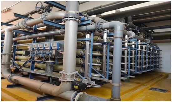 - The BWRO system consists of four production lines with a total capacity of 1250 m3 h−1, the system uses spiral-wound BWRO membranes TORAY TM720-400 (Toray Industries, Inc., Tokyo, Japan) distributed over two stages. The first stage consists of 42 pressure vessels (PVs), and the rejection flow from this stage feeds the second stage, which consists of 24 PVs.