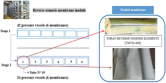 Fouling characterization is a procedure used to identify the cause of the RO failure []. A fouled membrane element selected for this study was removed from the second stage of line 2 (Figure 3). The BWRO membrane used to perform this operation was TORAY TM720-400 (Toray Industries, Inc., Tokyo, Japan). The characterization procedure includes selecting a representative membrane element, dissecting it, analyzing collected samples, identifying fouling constituents, and implementing corrective measures []. The sample was analyzed by visual inspection, X-ray diffraction (XRD), Fourier transform infrared spectroscopy (FTIR), and X-ray fluorescence spectrometry (XRF).