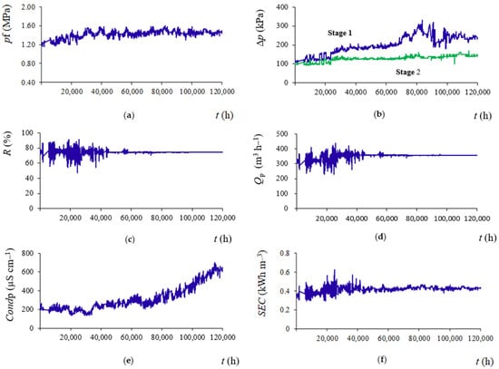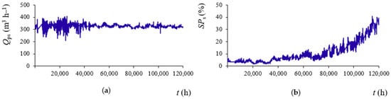 The standardization of Qp and salt passage SP was performed to determine the observable differences in RO unit performance caused by problems such as fouling, scaling, etc. During the initial 46,856 h, Qps fluctuated between 208 m3 h−1 and 405 m3 h−1, with an average of 326 m3 h−1 (Figure 5a). During these years, Qps fluctuated significantly, but remained at its maximum of 405 m h−1 for the entire 120,624 h. From 46,856 h, the Qps remained quite stable (around 328 m3 h−1). Conversely to this finding, several studies found a decrease in permeate flux [,,], which was attributed to the formation of a fouling layer on the membrane surfaces. The conventional method for assessing membrane fouling involves monitoring the decrease in flux over time. It has been shown that when the permeate flux is noticeably affected, the membrane is so severely fouled that restoration to its original permeability may become impossible [].