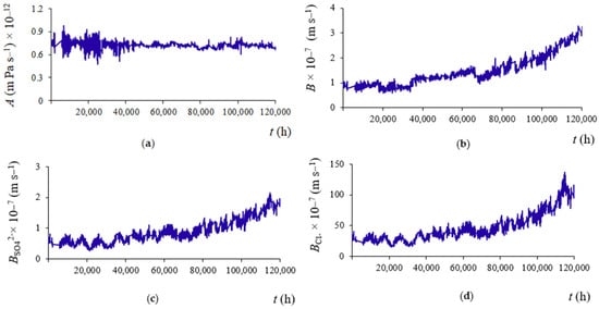 Evolution of permeability coefficients. (a) Water permeability coefficient; (b) Solute permeability coefficient; (c) Sulfate ion permeability coefficient; (d) Chloride ion permeability coefficient.