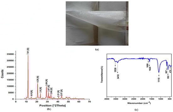 The spectrum obtained from the FTIR characterization of the fouled membrane is shown in Figure 7c. The peaks observed around 3530 cm−1, 3410 cm−1, as well as at 1620 cm−1 and 1690 cm−1 may be assigned to the hydrated components of gypsum, in particular hydroxyl groups and water [,]. The highest peak at around 1100 cm−1 is attributed to the presence of the SO42− functional group []. In addition, the spectrum shows two distinct peaks at 667 cm−1 and 596 cm−1, corresponding to the antisymmetric bending vibrations of SO42− [,]. The minor peak near 470 cm−1 suggests the presence of Si–O–Si, characteristic of silicon-based compounds []. As a result, FTIR analysis indicates that the fouling layer is composed of SO42− and hydroxyl functional groups. In addition, there are indications of silicon-based compounds, probably originated from feed water that contains high amount of silica. Based on the data provided, the peaks observed at wavelengths associated with hydrated components, such as hydroxyl groups and water, as well as the presence of antisymmetric bending vibrations characteristic of sulfate, suggest the presence of gypsum, which contains water in its crystalline structure.