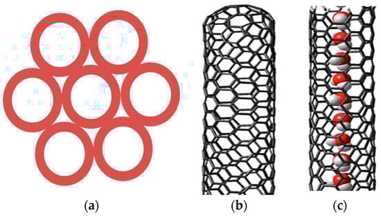 (a) A bundle of open-ended single-walled carbon nanotubes (SWNTs); (b) a sealed and empty single-walled carbon nanotube; and (c) a nanotube filled with water molecules [].