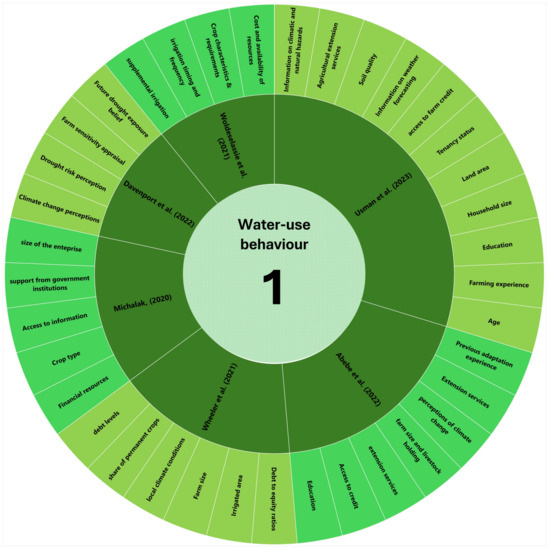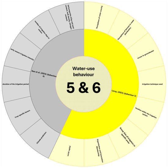 | Irmak et al. (2022) | [81] | The U.S. | Farmers’ irrigation practices and decisions (timing and amount of water applied) | The results suggest that irrigation decisions are not based on scientific data and protocols but are driven more by crop conditions, soil feel, personal schedules and neighbour practices. Substantial variability was found between fields regarding initiation, duration, and termination of irrigation season, irrigation frequency, and depth applied. The study found that different irrigation methods (centre pivot, gravity, subsurface drip) significantly influence water withdrawal and application patterns. The study found that initiating and terminating irrigation (starting 40–70 days after planting and ending 120–140 days after planting) are critical in determining water-use behaviour. The study found that peak water abstraction occurs during July and August, indicating a seasonal influence on water-use behaviour. The study also found that site-specific factors such as precipitation, soil moisture, and evaporative demand significantly impact irrigation requirements and water-use behaviour. In addition, the study showed that water allocation moratoriums influence irrigation practices and compliance with allocated water depths, thus affecting water-use behaviour. |