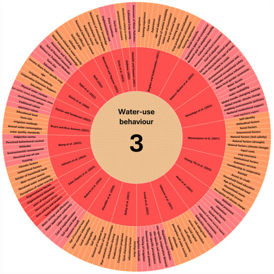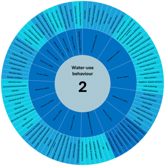 | Momenpour et al. (2021) | [79] | Iran | Farmers’ water-conservation behaviours (WCBs) | Seven factors influenced farmers’ water conservation behaviour (WCBs): institutional, economic, natural, extensional, social, attitudinal, and self-identity. Economic factors, such as input costs and crop insurance, had the largest impact on WCBs. Extension services from agricultural organisations, government policies, and natural conditions like drought, climate change, and soil salinity also impacted farmers’ WCBs. These factors accounted for 47.5% of the variance in WCBs. |