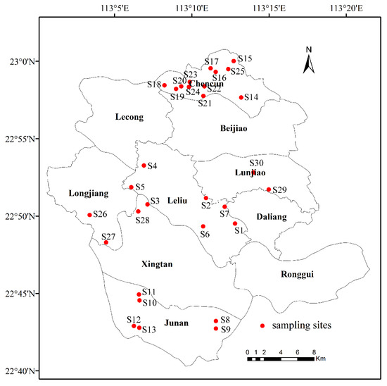 Foshan is a typical delta river network area, with the Xijiang and Beijiang tributaries of the Pearl River system running through the entire territory. In order to prevent pollution from rural domestic sewage, a number of DDWT facilities have been constructed in the area. This study investigated 30 rural DDWT facilities in Foshan (Figure 1), which included 13 anoxic/oxic (AO) facilities and 17 anaerobic/anoxic/oxic (AAO) facilities (detailed introductions to the AO and AAO processes are shown in Figure S1). The facilities ranged in capacity from 85 t/d to 2100 t/d, and served approximately 110,000 people in the region (Figure 2). The quality of the influent and effluent were surveyed two times, and the operating conditions of all facilities were evaluated from August 2020 to July 2021.