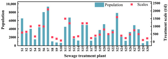 Population and treatment scales of the 30 rural decentralized domestic wastewater treatment facilities.