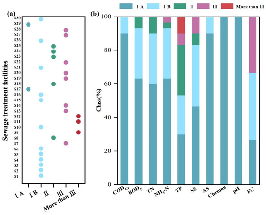 (a) Classification of water quality of the 30 rural decentralized domestic wastewater treatment facilities based on the discharge standard of pollutants for municipal wastewater treatment plants (GB 18918-2002). (b) Percentage of each classification of water quality parameters.