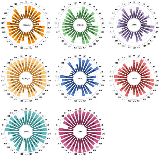 The removal efficiencies of the contaminants are shown in Figure 4. It was observed that the facilities for rural wastewater treatment exhibited different capabilities and large ranges of removal efficiencies. Specifically, the removal efficiencies ranged from 15.8% to 89.9% for CODCr, 7.2% to 89.4% for BOD5, 9.4% to 94.3% for TN, 18.5% to 99.2% for NH3-N, 5.7% to 98.0% for TP, 28.9% to 96.5% for SS, 50% to 98.5% for AS, and 38.9% to 99.9% for FC. The S10, S23, and S27 facilities demonstrated extremely low removal efficiencies for most indicators, suggesting that despite the fact that these three facilities are still in operation, they have become ineffective. This applied especially to the S10 facility which, while meeting class I B standards (Figure 3), had very low removal efficiencies for many contaminants, further illustrating the unreliability of evaluating operational states of treatment facilities based solely on whether effluents meet discharge standards. All of the rural DDWT facilities were designed according to their influent quality and quantity, and prior to their operational debut, a comprehensive final inspection was mandatory. Consequently, aside from variations in influent concentrations induced by human lifestyle habits, operational and maintenance practices account for the majority of effluent deterioration.
