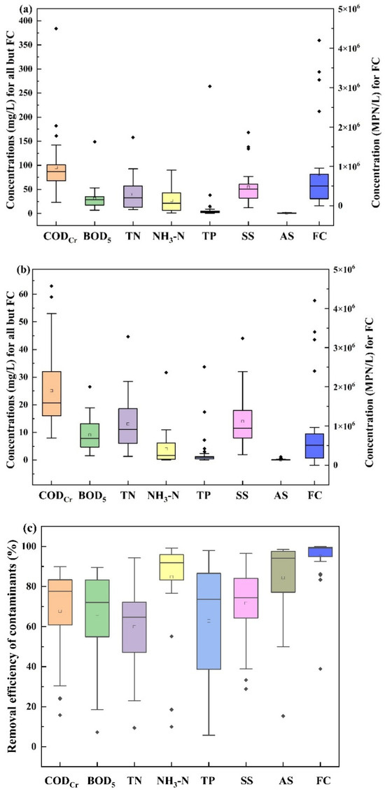 The boxplots of influent concentrations, effluent concentrations, and removal efficiencies of contaminants directly reflect the distribution of data. As shown in Table S1 and Figure 5, the median values of the influent concentrations were recorded as follows: CODCr at 87.00 mg/L, BOD5 at 28.67 mg/L, TN at 32.70 mg/L, NH3-N at 21.25 mg/L, TP at 3.35 mg/L, SS at 50.50 mg/L, AS at 1.04 mg/L, and FC at 5.05 × 105 MPN/L. After treatment by the facilities, the median values of effluent concentration were CODCr at 20.65 mg/L, BOD5 at 7.80 mg/L, TN at 11.10 mg/L, NH3-N at 1.71 mg/L, TP at 2.42 mg/L, SS at 11.50 mg/L, AS at 0.14 mg/L, and FC at 2.4 × 104 MPN/L, with the median removal efficiency values of CODCr 77.56%, BOD5 72.04%, TN 64.79%, NH3-N 91.83%, TP 73.56%, SS 74.41%, AS 94.12%, and FC 99.13%. These results suggest that AO and AAO technologies could effectively remove contaminants. The mean values of the contaminant removal efficiencies were CODCr 67.66%, BOD5 64.97%, TN 59.87%, NH3-N 84.74%, TP 62.86%, SS 71.64%, AS 84.36%, and FC 94.94%, respectively. This can be compared with other rural wastewater technologies reported in the literature. For example, Yang et al. [7] reported that the mean removal efficiencies of rural decentralized wastewater treatment facilities utilizing an anaerobic-anoxic-oxic membrane bio-reactor (AAO/MBR) were CODCr 72.79%, BOD5 83.81%, TN 75.48%, NH3-N 89.37%, and TP 64.14%, which were higher than our research. The main reason for this may be increasing membrane filtration, which ensures the effective removal of contaminants, as well as differences in the operation of the facilities, which should not be ignored.