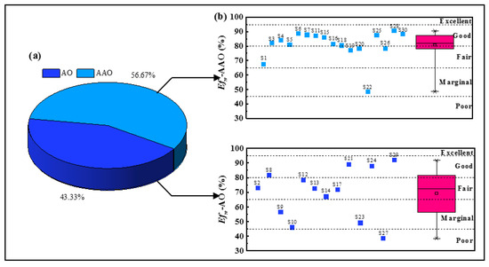 (a) Percentage of AO and AAO treatment processes. (b) A weighted average of the efficiencies () of removing CODCr, BOD5, NH3-N, TN, TP, SS, AS, and FC by AAO and AO processes, and boxplots of the .