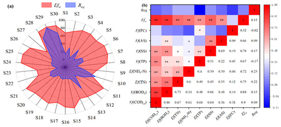 (a) Distribution of equipment failure rates of the 30 rural decentralized domestic wastewater treatment facilities. (b) Pearson correlation matrix between the removal efficiencies of indicators and the equipment failure rates. Note: * was significantly correlated at the 0.05 level (bilateral); ** was significantly correlated at 0.01 level (bilateral).