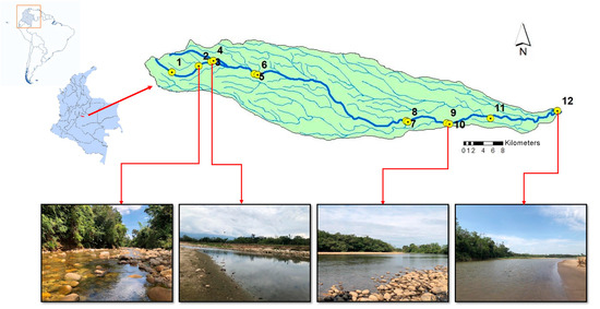 The Acacias River is located in the central-eastern part of Colombia, and ranges from its highest point at 1800 m above sea level (m.a.s.l.). at coordinates 03°58′26.2″ N–073°52′08.1″ W to its lowest point at 200 m.a.s.l. at coordinates 03°52′53.7″ N–073°06′43.7″ W. It is 119.61 km long with a total basin area of 497.87 km2. The annual precipitation in this area fluctuates between 2500 mm/year (station 12) and 6000 mm/year (station 1). In the upper basin zone, the flow ranges between 6171.6 and 817.7 L/s, and between 14,191.3 and 2317.6 L/s in its middle zone. The basin is characterized by agricultural, livestock, fishing and industrial activities related to the hydrocarbon sector. These particularities configure a pertinent context in which to analyze the relation between land use and water quality in the Acacias River (Figure 1).