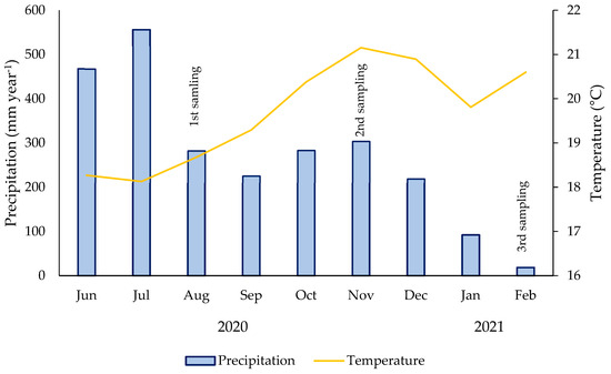 Twelve sampling stations with different land uses were established (Table 1) along the 119.61 km length of the Acacias River. Samples were collected 3 times based on the variable precipitation regime (Figure 2). For water quality monitoring purposes, a rigorous approach was taken. Samples were meticulously collected, and the analysis was carried out in a laboratory. The water sampling process was meticulously followed and involved careful collection. Refined plastic bottles were used for this purpose. Samples were diligently preserved at temperatures below 4 °C until the analytical processes were conducted following standardized procedures.