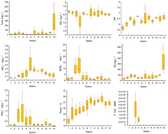The water quality analysis results of the sampling points are presented in Table 2, including the statistical analysis of the water quality parameters of the 12 river sections. Variations in physico-chemical, and microbiological properties were observed along the Acacias River, as shown in the box plots (Figure 3).