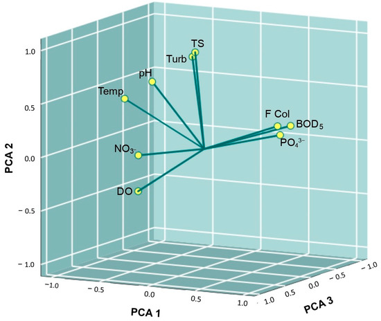 The PCA explained 84.34% of the total variance with the first three PCs (Table 5 and Figure 4). PC1 represented 38.76% of the total variance. It revealed a close relation among the parameters of fecal coliforms, phosphates and BOD5, which indicated contamination processes by organic matter. The parameters of fecal coliforms, phosphates and BOD5 directly indicate that it is associated with domestic and industrial wastewater discharges, which are linked to land use in urbanized areas [61]. PC2 explained 26.43% of the total variance, with total dissolved solids and turbidity being the parameters with the widest variation. These results coincide with those observed in the correlation analysis. PC3 accounted for 19.13% of the total variance and showed that nitrates had the most variation in the Acacias River surface waters; this was probably related to nitrogenous compounds coming from the fertilizers used in agricultural areas (i.e., oil palm crops in the basin) [62,63].