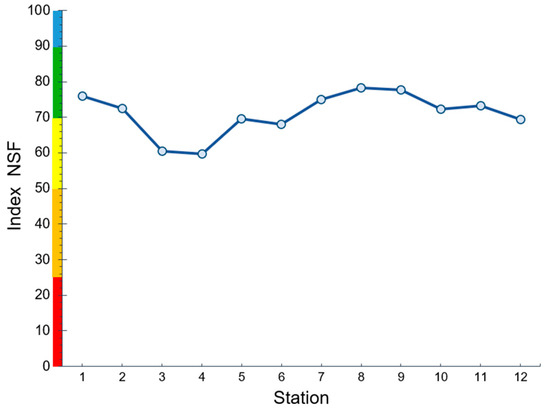 Both the quality and suitability of the water for drinking purposes in the selected river sections were assessed by determining the WQI. The NSF-WQI index results for the Acacias River showed that, on average 71.01, the water quality fell in the Good category of (Figure 5). The highest water quality values were obtained for stations 8 and 9, which are in agricultural areas, with the lowest values obtained in urban areas at stations 3 and 4.