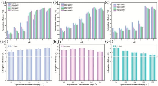 Adsorption capacities of Cu(II) (a), Cd(II) (b), and Zn(II) (c) at different pH values (2.0–8.0) and initial concentrations (Cu(II): 0.2–2.0 mg/L, Cd(II): 4.0–20 mg/L, Zn(II): 5.0–25.0 mg/L), under the experimental conditions of 30 °C and 160 rpm for 24 h. Additionally, the adsorption capacities of Cu(II) (a-1), Cd(II) (b-1), and Zn(II) (c-1) at pH 7 were also evaluated.
