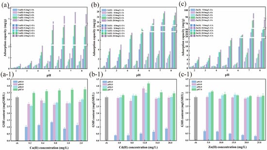 The adsorption capacities of Cu(II) (a), Cd(II) (b), and Zn(II) (c) inside and outside of Chlorella cells at different pH values (2.0–8.0) and initial concentrations (Cu(II): 0.2–2.0 mg/L, Cd(II): 4.0–20 mg/L, Zn(II): 5.0–25.0 mg/L) under the experimental conditions of 30 °C, 160 rpm, and 24 h of adsorption. Additionally, the changes in GSH content before and after adsorption of Cu(II) (a-1), Cd(II) (b-1), and Zn(II) (c-1) were studied.