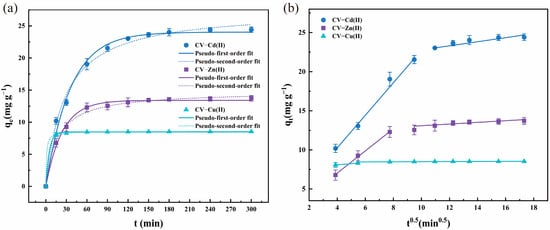 The adsorption of 2 mg/L Cu(II), 12.0 mg/L Cd(II), and 5.0 mg/L Zn(II) by microalgae at pH 7.0, 30 °C, and 160 rpm following the pseudo-first-order and pseudo-second-order kinetics models (a), and the adsorption of heavy metals following the intra-particle diffusion kinetics model within the microalgae (b).
