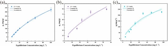 In this equation, Ce denotes the ion concentration at equilibrium (mg/L), qm signifies the maximal ion adsorption capacity (mg/g) [], the Freundlich empirical parameter is 1/n, the Langmuir constant is KL, and the Freundlich constant is Kf [].