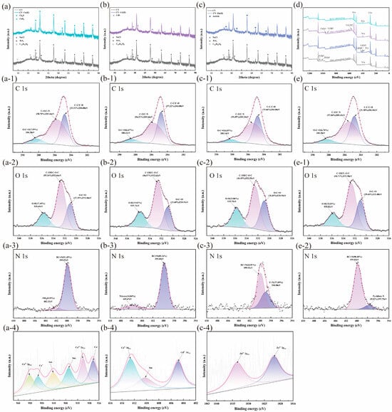 XRD of microalgae before and after adsorption of 2 mg/L Cu(II) (a), 12.0 mg/L Cd(II) (b), and 4.0 mg/L Zn(II) (c) under the experimental conditions of adsorption at pH 7.0, 30 °C, and 160 rpm for 24 h; XPS survey spectra after 24 h adsorption of 2 mg/L Cu(II), 12.0 mg/L Cd(II), and 4.0 mg/L Zn(II) (d); high-resolution XPS spectra of C 1s: (e) before adsorption and (a-1–c-1) after adsorption of Cu(II), Cd(II), and Zn(II), respectively; high-resolution XPS spectra of O 1s: (e-1) before adsorption and (a-2–c-2) after adsorption of Cu(II), Cd(II), and Zn(II), respectively; high-resolution XPS spectra of N 1s: (e-2) before adsorption and (a-3–c-3) after adsorption of Cu(II), Cd(II), and Zn(II), respectively; high-resolution XPS spectra of Cu 2p (a-4), Cd 3d (b-4), and Zn 2p (c-4) for microalgae.