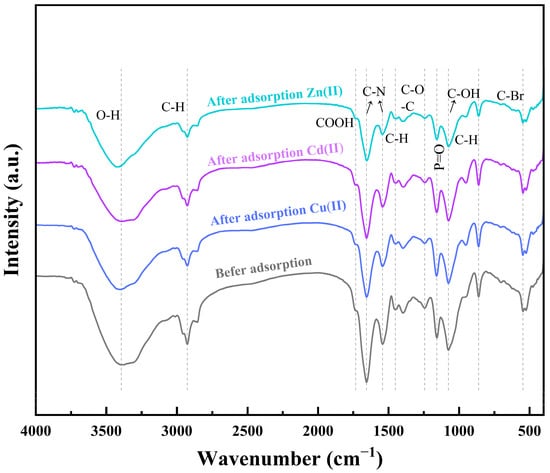 Numerous studies have demonstrated that cells’ surfaces are adorned with negatively charged functional groups, including COOH, O-H, and P=O, which can undergo ion exchange with heavy metal ions, constituting a mechanism for biological adsorption []. Bifunctional structures with characteristic groups such as C-N, P=O, and O-H are also very effective at chelating heavy metal ions, in addition to negatively charged functional groups. From the graphs, it can be seen that the peaks before and after adsorption changed significantly around 1732, 1656, 1542, 1244, 1157, and 1075 cm-1. These changes correspond to the vibrational frequencies of COOH, C-N, P=O, C-O-C, and C-OH functional groups, respectively. This finding suggests that Cu(II), Cd(II), and Zn(II) can bind to specific functional groups on the microalgae’s surface to facilitate adsorption. Consequently, this validates the involvement of diverse functional groups observed in XPS with heavy metal ions during the adsorption process.