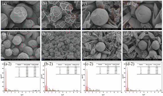 The morphological characteristics of microbial cells can be examined using SEM. This technique allows for the analysis of alterations in the surface morphology of cells following the adsorption of heavy metal ions. The surface properties of algal biosorbents after adsorbing Cu(II), Cd(II), and Zn(II) were characterized using SEM, and the electron micrographs are shown in Figure 7(a–d,a-1–d-1). It is evident that the microalgae maintain a spherical shape and have folds on the cell surface, providing a good condition for the fixation of heavy metals. Before adsorption, the surface of microalgae cells is smooth, without any attachment, and the cell structure is intact. After the adsorption of Cu(II), the surface texture of the microalgal cells shows increased roughness, similar to a mesh, and exhibits shrinkage and deformation. In addition, particulate matter is attached to the cell surface. Following the uptake of Zn(II) and Cd(II) by microalgae, different degrees of damage and disintegration of microalgal cells can be observed, as shown in Figure 7. Numerous asymmetric crystal micro-precipitates are seen on the surface of the microalgal cells. The disintegration of cell structures could be attributed to the lysis of the cell wall and membrane induced by heavy metal ions, which disrupts the cellular architecture. The formation of microprecipitates on cell surfaces is a crucial and highly significant mechanism for the biosorption-based removal of heavy metals []. Furthermore, Chlorella cell surfaces contain sites for adsorbing heavy metals []. The cell wall of microalgae is mainly composed of EPS consisting of polysaccharides, lipids, and proteins, which provide various functional groups. Since these substances contain functional groups with negative charges, they interact with heavy metal cations to form complex compounds, which can help in the adsorption, fixation, and precipitation of metal ions, thereby reducing the toxicity of heavy metals []. Wang et al. [] found that after Chlorella adsorbed Hg(II), the EPS present on the cell surface can form complexes with Hg(II) to produce protruding particles and create metallic minerals bound by Hg(II). Meanwhile, observations by S. Li et al. [] used SEM to demonstrate that Chlamydomonas reinhardtii forms Pb-containing minerals on its cell surface following the adsorption of Pb(II).