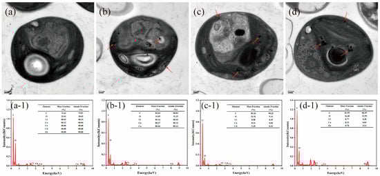 Utilizing TEM, the ultrastructural characteristics of the cells were investigated, and the intracellular distribution of heavy metal ions was determined. The TEM micrographs of the microalgae after adsorbing Cu(II), Cd(II), and Zn(II) are displayed in Figure 8a–d. From the figures, different positions, sizes, and shapes of black spots (indicated by arrows) appear within the adsorbed microalgal cells, possibly due to the accumulation of heavy metals inside the cells. Li et al. [] also observed using TEM the accumulation of zinc in Chlamydomonas reinhardtii cells to form aggregates after zinc adsorption. Cheng et al. [] further demonstrated that uranium can enter Ankistrodsemus sp. cells through normal metabolic processes and form uranium-containing crystals.