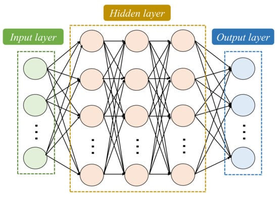 The MLP is a type of feedforward artificial neural network. Its structure (Figure 1) consists of an input layer, multiple hidden layers, and an output layer, providing strong nonlinear fitting capabilities [37]. The training process of the MLP involves two main stages: forward propagation and backward propagation. During forward propagation, data are inputted into the input layer and processed sequentially through each hidden layer. The prediction result is finally obtained at the output layer. The output of the m-th neuron in the l-th layer y m l can be calculated as follows:
