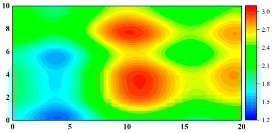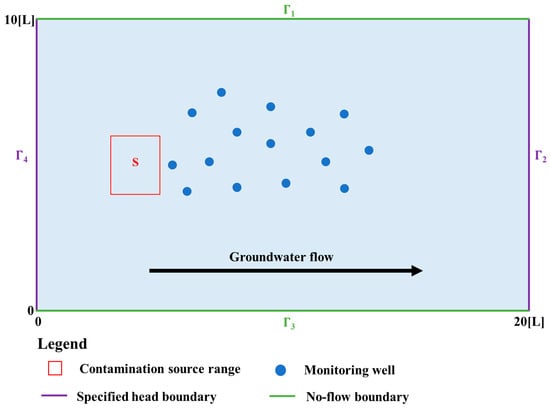 In this study, a hypothetical numerical case was utilized to verify the effectiveness of the proposed methods and theories. This case was modified from Zhang et al. [43]. As depicted in Figure 3, the simulation area was a 2D confined aquifer with a size of 20 × 10 [L], featuring stable water flow from left to right. In the solute transport model, the left and right boundaries were seen as specified concentration boundaries, with the concentration at the left boundary being unknown. The expressions of initial and boundary conditions are shown in Equation (22). Additionally, to better characterize the uncertainty of hydrogeological parameters, the hydraulic conductivity field K was considered heterogeneous. The logarithmic form Y = ln K was used to represent the field K. The covariance function for any two points (xa, ya) and (xb, yb) is shown in Equation (23). In this work, we adopted the Karhunen–Loève (KL) expansion [44] to describe the reference Y field (Figure 4), as shown in Equation (24).