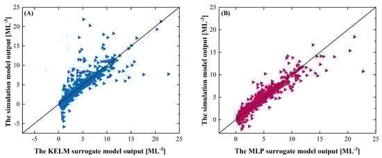 Figure 5. The fitting diagrams of the different surrogate models. (A) The KELM surrogate model and (B) The MLP surrogate model.