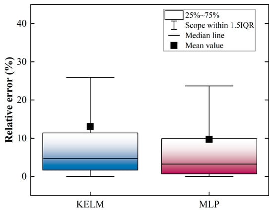 The final results of the two surrogate models are presented in Table 2. To illustrate the effectiveness more intuitively, fitting diagrams of the different surrogate models to the simulation model and relative error box plots were drawn, as shown in Figure 5 and Figure 6. In Figure 5, the data points obtained by the MLP surrogate model were closer to the y = x line, indicating a more concentrated and better fit to the simulation model. In Figure 6, data points within the 1.5 IQR range were considered normal, with 25% and 75% representing the lower and upper quartiles, respectively. Compared to the relative error results of the KELM surrogate model, the upper whisker, upper quartile, median line, and mean line of the MLP surrogate model were lower, demonstrating that the MLP surrogate model had higher prediction accuracy. Additionally, as shown in Table 2, each indicator result of the MLP surrogate model was superior to that of the KELM surrogate model. Thus, in this case, the DL surrogate model established by the MLP method exhibited advantages and overall better prediction performance. Therefore, the MLP surrogate model was used for GCSR.
