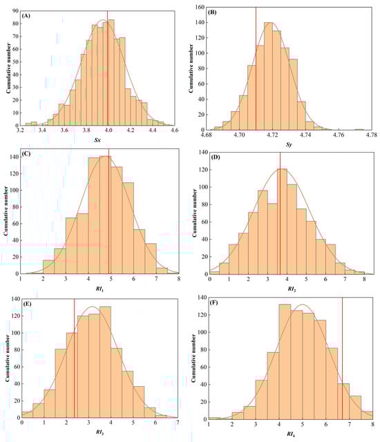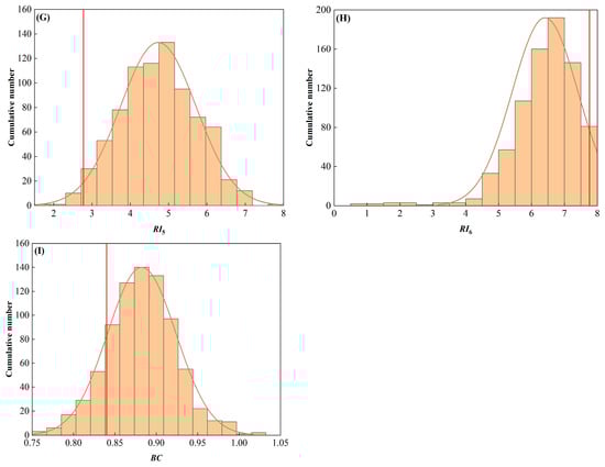 Figure 7. The ensemble distribution obtained in the first-stage inversion process. (A) Sx, (B) Sy, (C) RI1, (D) RI2, (E) RI3, (F) RI4, (G) RI5, (H) RI6, and (I) BC. The red line represents the corresponding reference value of each variable.