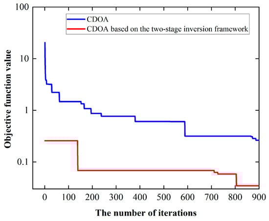 When the CDOA was used for GCSR, an individual represented a set of the unknown variables in the inverse problem, and the position of the individual can be seen as the solution of the unknown variable. The process of finding the optimal position was the process of obtaining the optimal solution, i.e., the process of solving the inverse problem. In GCSR, the sum of squared errors between the surrogate model output data and the actual monitoring data was adopted as the objective function (Equation (29)). The smaller the objective function value, the closer the solution is to the reference value. In this work, the key parameters N and T were set to 75 and 900, respectively.