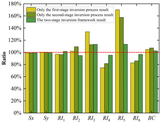 Finally, the identification results obtained through the two-stage inversion framework are presented in Table 1. We employed the MRE and MAE to evaluate the performance. Compared to the first-stage inversion results, the identification results from the two-stage inversion framework were generally closer to the reference values. Further calculations indicated that the MRE and MAE of the inversion results from the first stage were 17.53% and 0.6789, respectively. However, upon completion of the two-stage inversion framework, the MRE and MAE decreased to 4.95% and 0.1756, respectively. This demonstrated that the introduction of the second stage for a refined deep search significantly enhanced the inversion accuracy. Additionally, a comparison was made between the final estimated results and those obtained using the second-stage inversion process alone. The convergence curves of the CDOA search process under these two scenarios are plotted in Figure 8, where a logarithmic scale was used for the vertical axis for better visualization. It is evident that the initial value of the CDOA based on the two-stage inversion framework was significantly better than that using CDOA alone, attributable to the first-stage inversion process. Moreover, the CDOA based on the two-stage inversion framework had a significantly smaller final objective function value compared to CDOA alone. This indicated that the two-stage inversion framework improved the search efficiency of the optimization algorithm and enhanced its ability to avoid local optima to some extent. For inversion accuracy, the degree of approximation of the identification results to the reference values under different inversion scenarios is plotted in Figure 9. From Table 1 and Figure 9, it can be seen that the introduction of the first-stage inversion process reduced the MRE from 13.78% to 4.95%, and the MAE was also reduced from 0.5389 to 0.1756. Compared to using the second-stage inversion process alone, the preliminary global broad search of the first stage proved to be beneficial and effective. The first-stage inversion process provided better initial values and optimized intervals for each unknown variable, thereby enhancing the accuracy of the subsequent inversion stage.