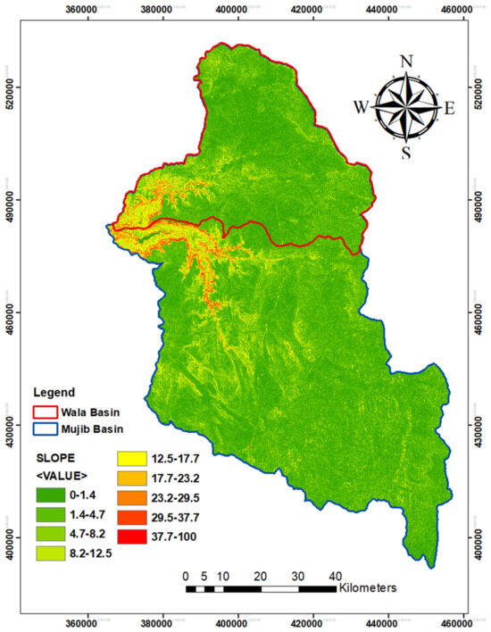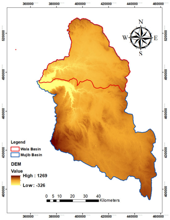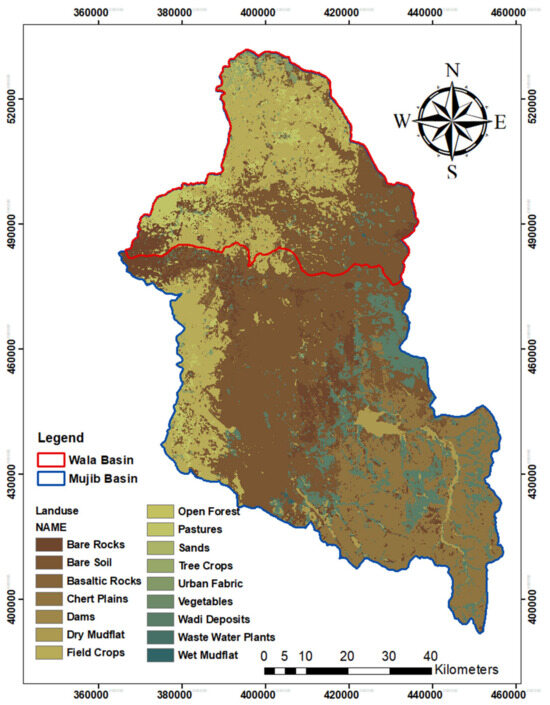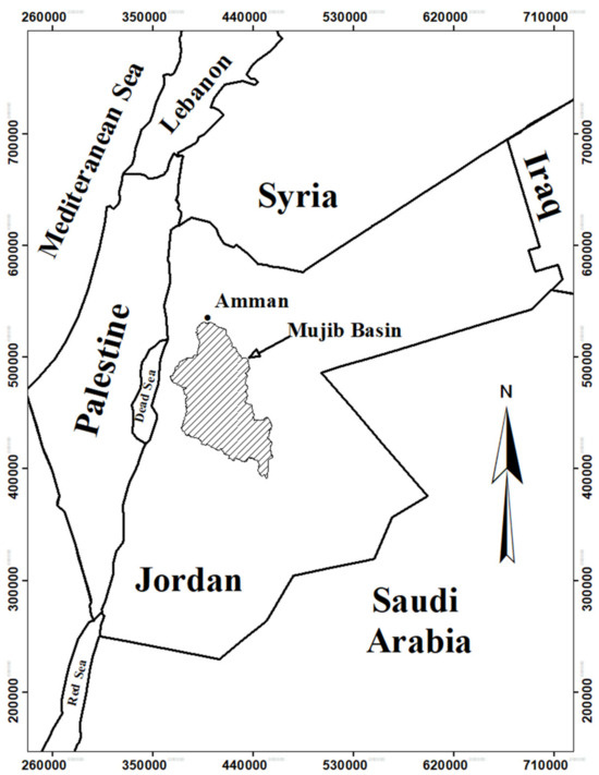 In the heart of Jordan lies the precisely studied Mujib Basin, strategically positioned in the central region, showcased in Figure 1. Defined by the Palestinian grid coordinates spanning from 205 to 297 east and 10 to 146 north, this expansive basin covers an extensive area of approximately 6397 km2. Noteworthy for its hydrological significance, it comprises two major catchment areas: the Wadi Mujib catchment, covering around 4297 km2, and the Wadi Wala catchment, spanning about 2100 km2. Geographically, it is flanked to the west by the Dead Sea catchment, to the north by the Zarqa Basin, to the east by the Azraq Basin, and to the south by the Jafr Basin.
