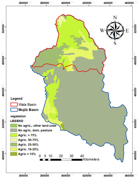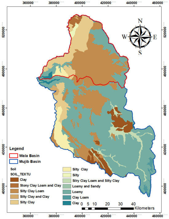 This region is enveloped by the Al-Karak, Amman, and Ma’an governorates, encapsulating an area of 4297 km2. The altitude within this captivating landscape fluctuates between 1269 and −326 a.m.s.l., as depicted in Figure 2. The terrain, predominantly comprising 88.9% bare soil and rocks, undergoes a harmonious transformation with 10.9% adorned by vegetation, including pastures and forests. The residual area is allocated for urban development, as displayed in Figure 3. A closer examination of the soil texture distribution unfolds, revealing that loam constitutes a substantial 60.7%, followed by clay at 23.6%, and the remaining spectrum encompasses diverse soil types, as vividly portrayed in Figure 4. The vegetation cover unfolds in Figure 5, with approximately 6.8% dedicated to dense forests, while the rest exhibits low density or unveils the natural allure of bare soil. This comprehensive exploration offers a nuanced understanding of the Mujib Basin and Wadi Mujib, laying the groundwork for insightful hydrological evaluations and ecological analyses.