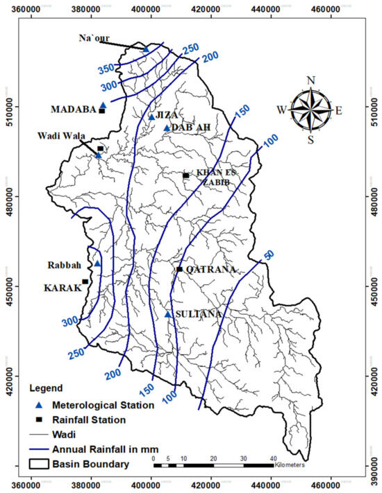 For comprehensive hydrological calculations, data from seven meteorological stations with robust datasets were harnessed for this study. These stations, namely Na’our, Madaba, Wadi Wala, Rabbah, Hassan, Al Jiza, and Qatrana, were strategically chosen. The mean temperature at each station reflects its elevation, with Wadi Wala station exhibiting higher figures due to its lower elevation. The average annual minimum and maximum temperatures across all stations stand at 10.2 °C and 22.6 °C, respectively.