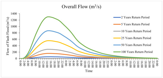 Shifting focus to rainfall data analysis, this study employed frequency analysis to statistically scrutinize the dataset. The coefficient of determination (R2) played a key role in identifying the most suitable distribution, with the General Extreme Value (GEV) distribution employed, plotted using the Weilbull formula. The comparison between actual and predicted rainfall exhibited a remarkably high coefficient of determination (R2) exceeding 0.99, attesting to the robustness of the chosen distribution model. This statistical foundation set the stage for determining the return period (2, 5, 10, 25, 50, and 100 years) of rainfall, offering a comprehensive perspective, illustrated in Figure 9 and detailed in Table 6. Expanding the analysis further, this study estimated flash flood flow at different return periods, enhancing our understanding of potential scenarios. Figure 10 and Table 7 comprehensively present the outcomes of these estimations, shedding light on the dynamic relationship between rainfall patterns and flash flood magnitudes under varying return periods. The thoroughness of this analytical framework underscores this study’s commitment to unraveling the complexities of hydrological dynamics with precision and rigor.
