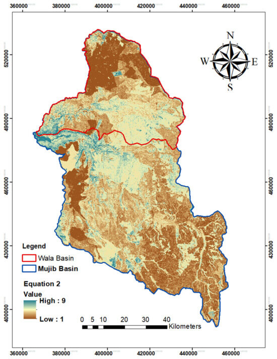 Leveraging the raster calculator feature within the ArcGIS software, the FFPI is determined through Equation (2), generating a detailed map encapsulating flash flood potential across Wadi Mujib. Figure 11 visually presents this map, highlighting potential locations with varying index values. Notably, the FFPI ranges from 1 (indicating the lowest potential) to 9 (representing the highest). This dynamic mapping approach provides a spatially explicit understanding of flash flood vulnerability.