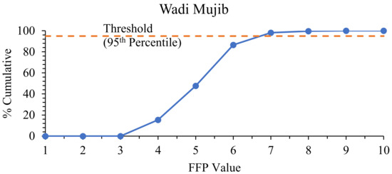 Figure 12 elucidates the 95th percentile threshold, showcasing a static trend at the chart’s summit beyond this percentile. Through this method, it is established that the 95th percentile for the FFPI map is 7. This implies that areas with an index value of 7 or higher exhibit the highest flash flood potential. Quantitatively, this high-risk region spans 575.12 km2, constituting 13.39% of the total basin area, predominantly situated in the western part of the basin.