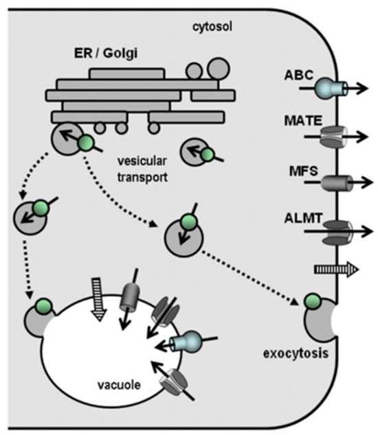 Schematic diagram of root cells. The round symbol depicts a generic transporter loading compounds into the vesicles. The membrane-bound transport proteins known to facilitate the transport of compounds across membranes include the ATP binding cassette family (ABC), the multidrug and toxic compound extrusion family (MATE), the major facilitator superfamily (MFS), and the aluminum-activated malate transporter family (ALMT). The striped arrow indicates the possible diffusion pathway of highly hydrophobic compounds across the lipid bilayers. The other arrows show the direction of substrate movement. Reproduced with permission from [20]. Copyright 2012, Oxford University Press.