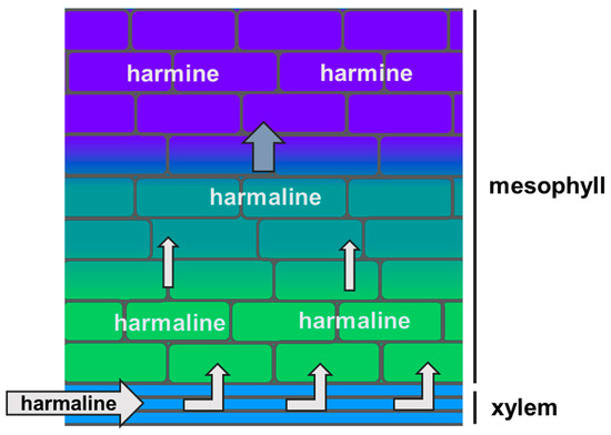 Recent studies have shown that plant secretions are released into the environment through various processes. They are leached from decomposed plant residues and the roots or leaves of living plants. These processes are related to the beneficial effects of crop rotation or co-cultivation of certain submerged plants. The exchange of natural products between important plants may explain these ambiguous phenomena [21]. Moreover, the absorbed natural products in some recipient plants are modified, while they simply accumulate in other recipient plants. These modifications include hydroxylation, methylation, and glycosylation processes. In the past, it was thought that these reactions were part of a deliberate detoxification mechanism known as the “green liver concept”. However, since the manner and extent of these modifications vary greatly between different plant species, general and universal mechanisms such as the “green liver concept” can be ruled out [22]. The study by Laura Lewerenz et al. was the first to bring to life the phenomenon of “lateral natural product transfer”. Figure 2 shows that harmaline is translocated via the xylem into the leaves. Subsequently, the constituents of the xylem are further distributed within the leaf blade, driven by transpiration and root pressure. In the further distribution of the alkaloids within the leaf blade, increasing harmaline is oxidized, resulting in a continuous increase in the ratio of harmine to harmaline [23]. In addition, studies by Tahani Hijazin et al. from the same team also confirmed that various alkaloids are effectively absorbed from the soil, which is strongly influenced by the rhizosphere pH due to their alkaline nature. However, intense caffeine intake is not affected by the various pH values. pH significantly affects the uptake of alkaloids, and the highest uptake appears to be achieved at a specific pH. Thus, the absorption of various alkaloids and their dependence on pH may vary, and the extent of alkaloid absorption cannot be predicted [24].