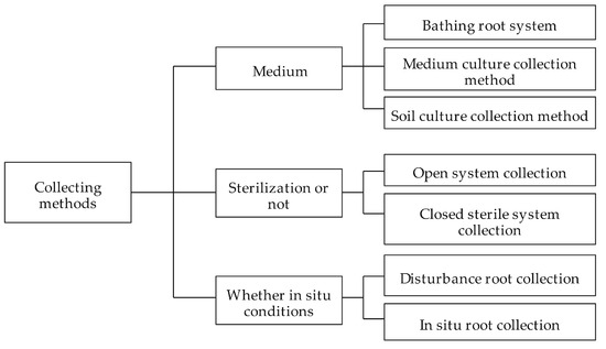 Processes of collecting root exudates are troublesome due to many interfering factors and uniform research methods. Different conditions have different classification standards. Thus, the correct and effective collection of plant root exudates is a key step in correctly studying the chemical composition of root exudates. Figure 3 shows commonly used methods for collecting root exudates. Among them, the root exudates collected under closed, sterile conditions can more accurately reflect the total amount of organic matter, and in situ collection under soil culture conditions can more accurately reflect the actual situation of root exudates. Thus, researchers can select appropriate collection methods in accordance with different experimental purposes [25,26,27]. The most commonly used method for collecting the root exudates of submerged plants is the disturbance collection method. After submerged plants are uprooted and cleaned, they are immersed in a certain amount of ultrapure water and placed in the dark for 24 h. Then, the soaking solution is filtered as the crude root exudates, followed by subsequent treatment.