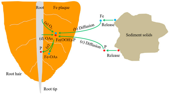 Schematic illustration of the coupling processes between Fe (blue color) plaque enrichment and organic acid complexation in liberating P (red color) in the V. natans rhizosphere. The lowercase letters show the process sequence. Reproduced with permission from [40]. Copyright 2017, Elsevier.