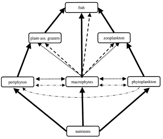 A schematic overview of interactions between submersed macrophytes and other constituents of shallow lake food webs. (—): food web links; (⋯): allelopathy; (– – –): spatial refuge; (–··–··–): light conditions. Reproduced with permission from [65]. Copyright 2002, Elsevier.
